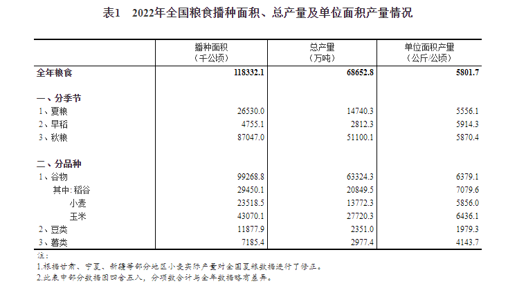 根据对全国31个省(区、市)的调查,2022年全国粮食播种面积、单位面积产量和总产量分别如下:一、全国粮食播种面积118332千公顷(177498万亩),比2021年增加701千公顷(1052万亩),增长0.6%。其中谷物[1]播种面积99269千公顷(148903万亩),比2021年减少908千公顷(1362万亩),下降0.9%。二、全国粮食单位面积产量5802公斤/公顷(387公斤/亩),比2021年减少3.3公斤/公顷(0.2公斤/亩),下降0.1%。其中谷物单位面积产量6379公斤/公顷(425公斤/亩),比2021年增加62.7公斤/公顷(4.2公斤/亩),增长1.0%。三、全国粮食总产量68653万吨(13731亿斤),比2021年增加368万吨(74亿斤),增长0.5%。其中谷物产量63324万吨(12665亿斤),比2021年增加49万吨(10亿斤)。